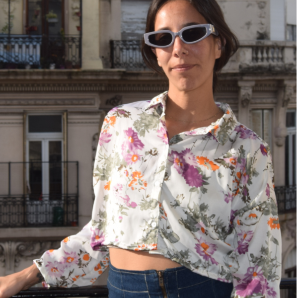 Camisa crop top de seda estampada. Es tipo mangas 3/4 y tiene un botoncito en el codo para que las puedan arremangar. Cuello italiano.