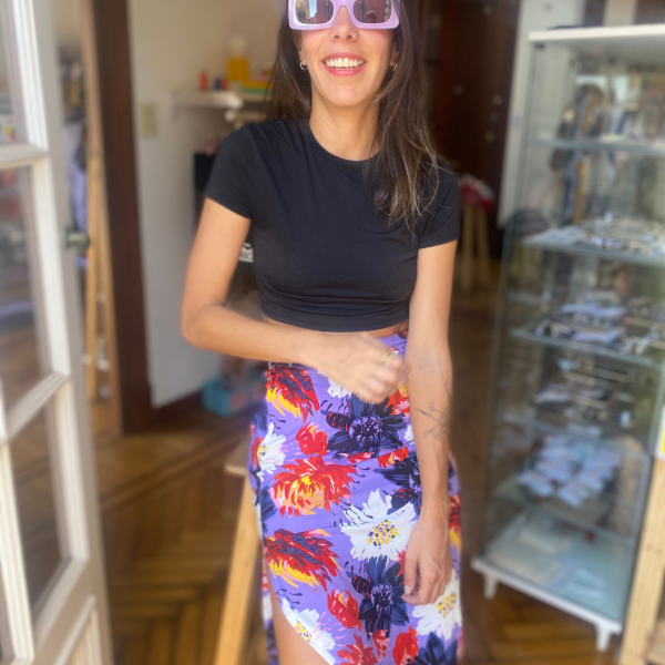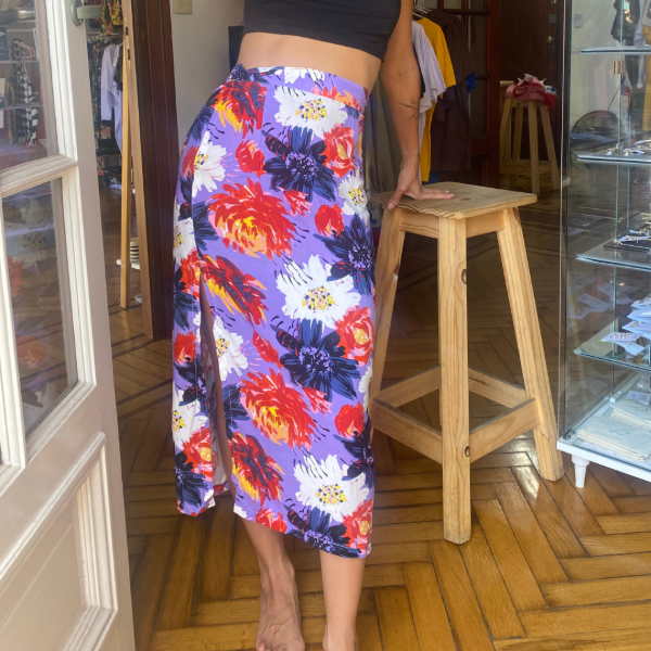 Falda largo midi con elástico en la cintura trasera, para que se adapte mejor al cuerpo. Tiene un tajo al costado, lo que la hace súper cómoda para moverse.