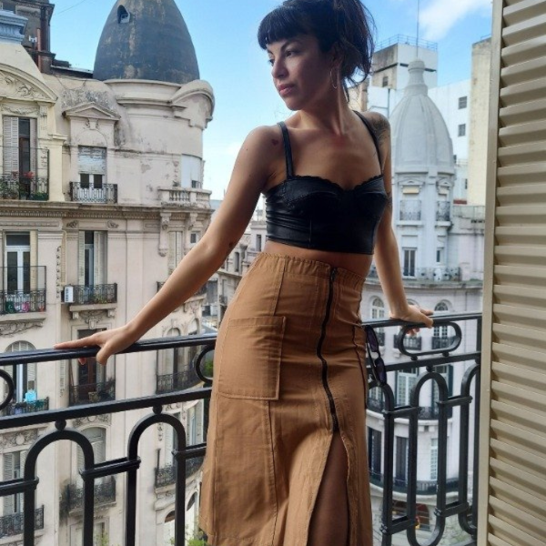 Pollera larga por debajo de las rodillas con cierre delantero y bolsillos cargo a los costados.