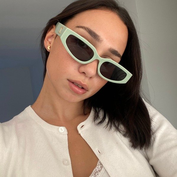 Anteojos premium de armazón de acetato verde claro y cristales negros, sin graduación. Detalles dorados en las patillas.