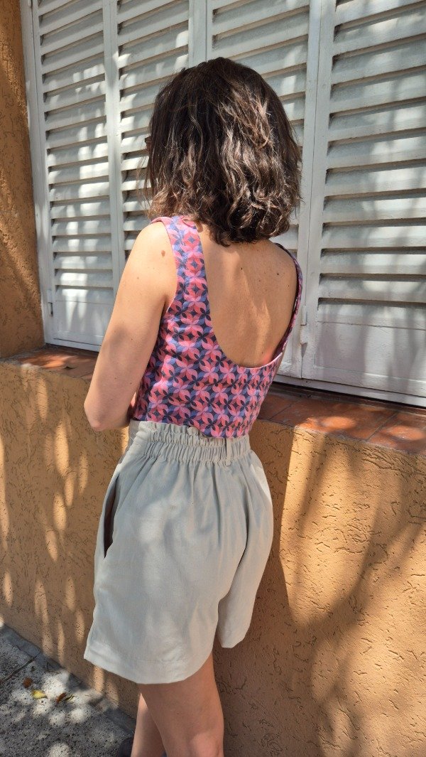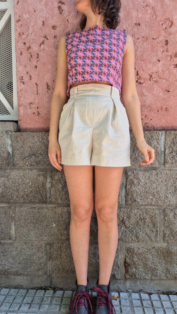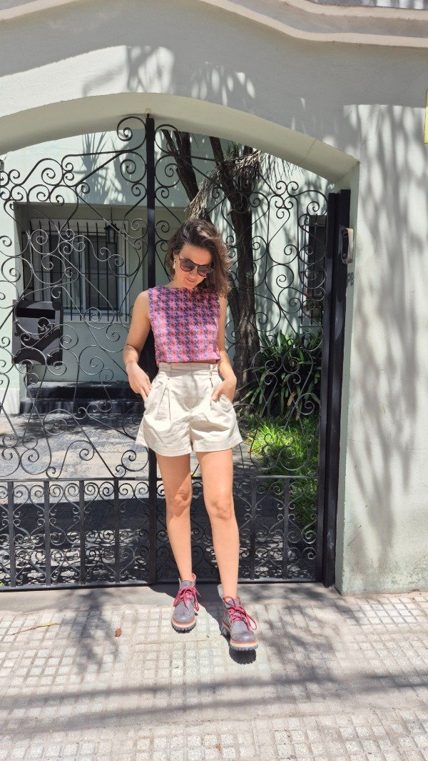 Esta prenda está pensada para que te acompañe todo el verano en ocasiones muy distintas. Tiene pinzas encontradas en el delantero que le dan un toque sastero a la bermuda, pero con elástico ajustable detrás que lo hace súper cómodo. No tiene cierres ni botones, se sube como un jogging para conservar la sensación de comodidad y que nada moleste al usarlo. Tiene bolsillos y presillas por si quiere usarse con un cinturón para darle más formalidad.