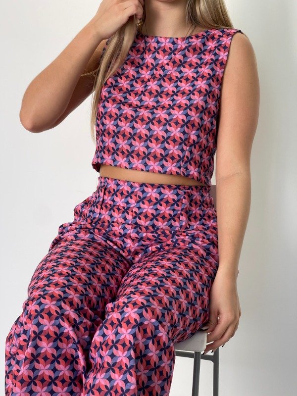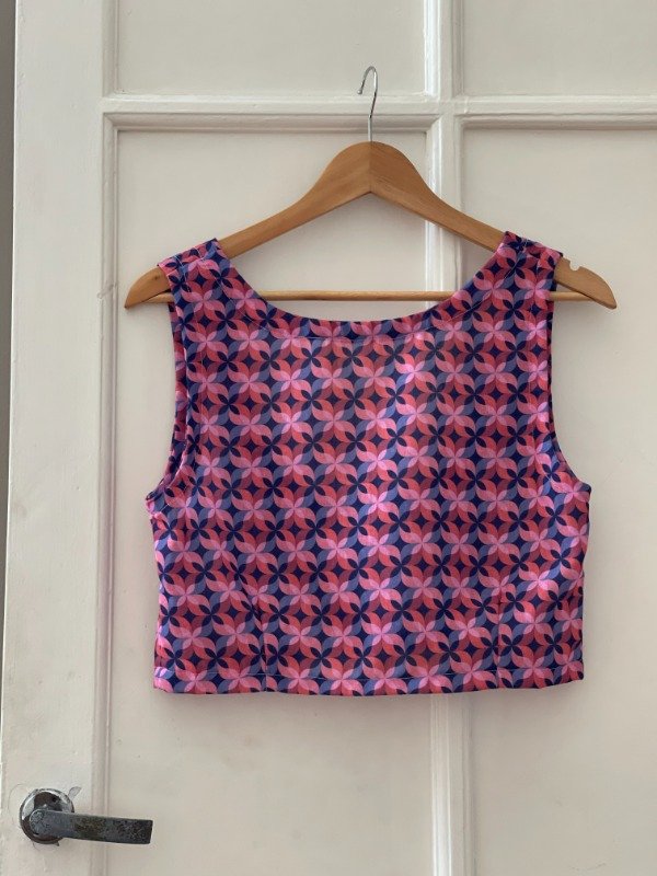 Top con un escote cerrado delante y con una espalda amplia detrás, por lo que tiene un uso muy cómodo y sensual al mismo tiempo. Tiene pinzas debajo del busto que le aporta un calce levemente entallado afinando a la vista el comienzo de la cintura.